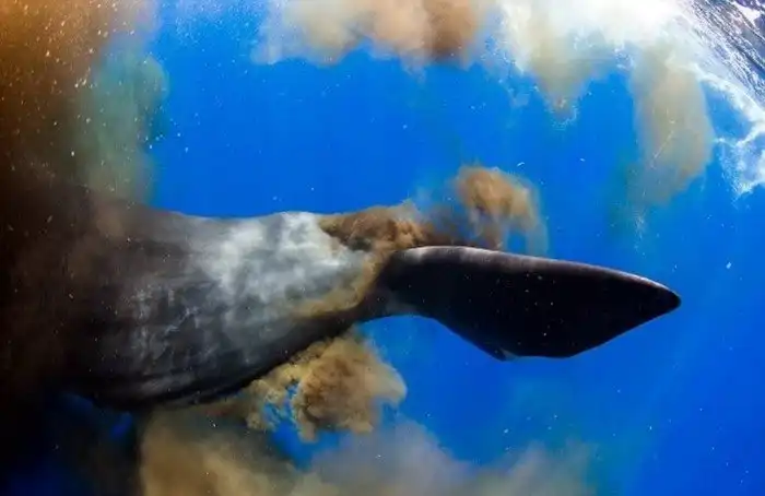 Кашалот, хоть и само по себе крупное животное, защищается оно, выпуская облако красноватой жидкости, похожей на кровь.