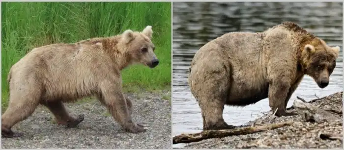 Так что же нужно сделать мишкам, чтобы принять участие в конкурсе? Они все должны побывать на реке Брукс, где установлены веб-камеры. За медвежьей рыбалкой тут наблюдают онлайн. Если исхудавший после спячки мишка приходит на берег весной и осенью, когда он активно готовится к зиме, у него есть все шансы стать победителем. Предлагаем вам посмотреть на участников сезона 2022 и подивиться тому, как меняются медвежье «до» и «после» спячки. Ну и, конечно же, узнать, кто стал победителем.Мишка по кличке Чанк в июле и в начале сентября