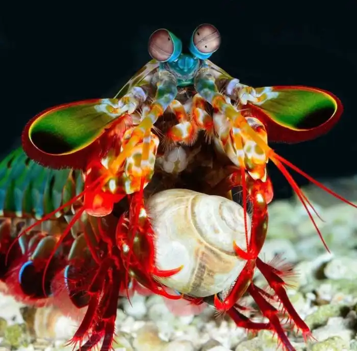 Кстати, про глаза. Они у рака-богомола тоже особенные. Мало того, что они вертятся на 90 градусов вне зависимости друг от друга, так ещё и цветов воспринимают в 4 раза больше наших. У раков-богомолов 12-канальное цветовое зрение. Для сравнения, человек воспринимает только 3 канала: красный, синий и зелёный.