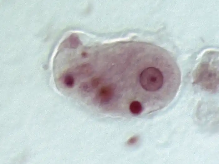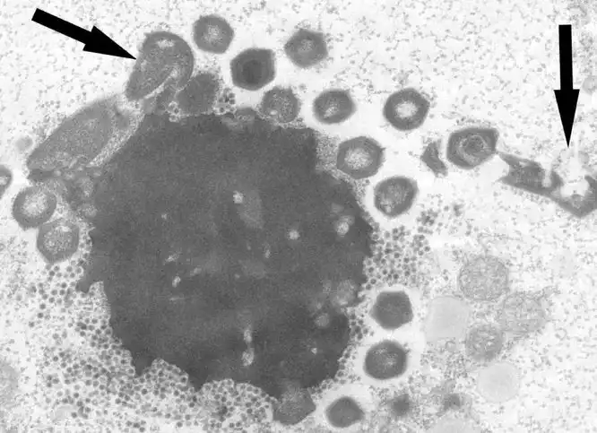 Белые точки на которые указывает стрелочка – вирусы внутри вируса.