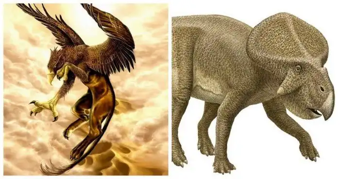 Грифон - мифологическое крылатое существо с туловищем льва и головой орла. Казалось бы, ни одно животное не подходит под описание. Но историк Адриена Майор предположил, что образ грифона был навеян окаменевшими скелетами проживающих на территории Алтая динозавров протоцератопсов. Это объясняет большие размеры тела животного и наличие клюва и «крыльев», которые могли быть остатками костного воротника динозавра.