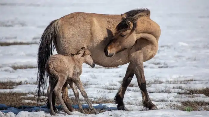 Зимняя пастьба называется тебенёвкой. В таких суровых условиях выживают даже новорождённые коняшки.