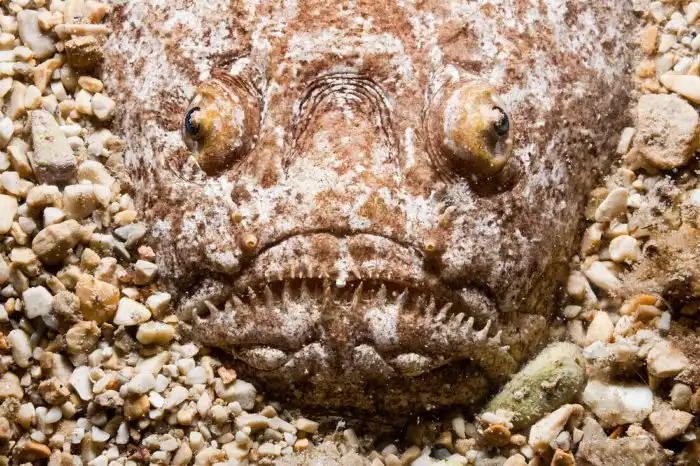 Третья причина, по которой вы не захотите встречаться со звездочётом, — это его манера общения с окружающими. Пока рыб сидит в засаде, его не видно и не слышно. Но если на горизонте замаячил потенциальный обед, он пулей выскакивает из-под песка. В охоте коровке помогает всё её строение: глазки на макушке этих рыб высматривают будущую жертву, а вертикальное строение челюстей помогает эту самую жертву захватить за доли секунд.