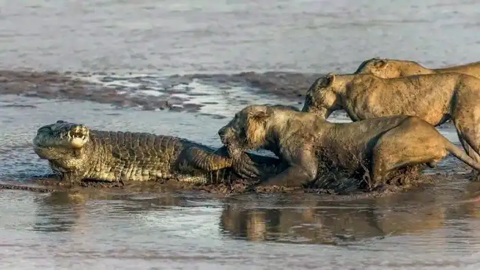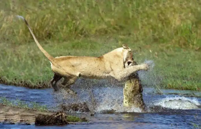 Время от времени крупные крокодилы обедают львами, которые переплывают водоёмы. Поэтому большие кошки по возможности стараются избегать озёр и рек.