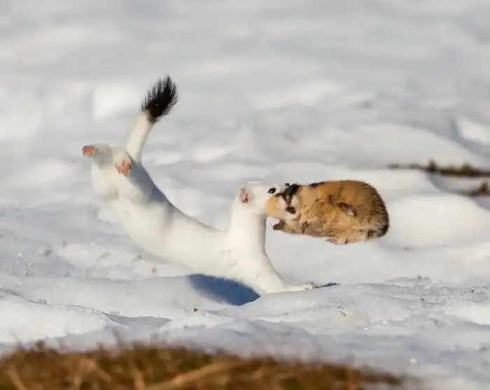 Однако в Сибири и на Камчатке горностаев фермеры-скотоводы прикармливают специально — зверьки отлично справляются с вредными грызунами в амбарах и на складах.