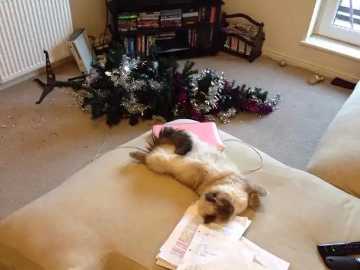 Сложно сказать, что именно так привлекает озорных хулиганов в этом деревце. Мишура, игрушки, яркие гирлянды или всё вместе? В любом случае, если вы не подготовитесь и оставите вашу ёлочку без защиты, как сделали хозяева этих котиков, то новогодней котострофы вам не избежать.