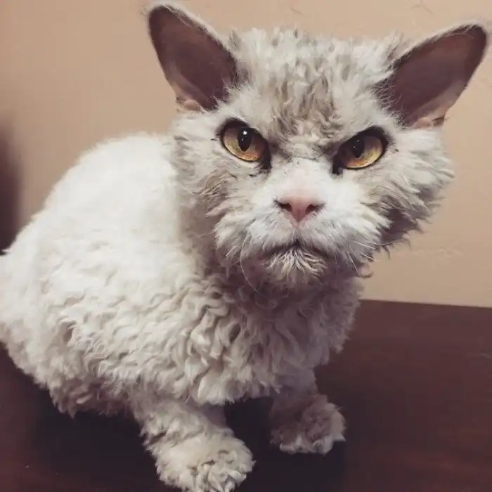 Этого кота зовут Альберт (Albert), и он - товарищ с необычным выражением мордочки. Его фишка в том, что он всегда выглядит угрюмым и недовольным всем происходящим. Помимо мордочки, у него нестандартная шерсть - может показаться, что за ним давно не ухаживали, но на самом деле, это особенность его породы - селкирк-рекс. Порода отличается волнистой или кудрявой шерстью, и очень напоминает плюшевого мишку.