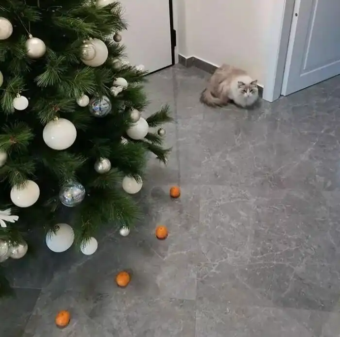 Защита ёлки от нападений кота - мандарины