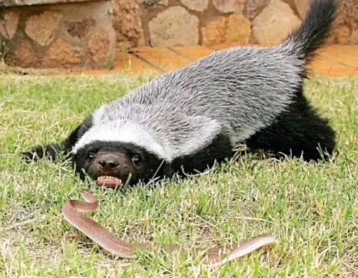 Медоед невосприимчив и к змеиному укусу. Если кобре все же удается пробить толстую кожу и впрыснуть порцию яда, зверь падает, бьется в агонии и замирает неподвижно. Однако уже через 30-60 минут «мертвый» медоед подает признаки жизни. Вскоре его самочувствие приходит в норму, животное выглядит бодрым и активным.