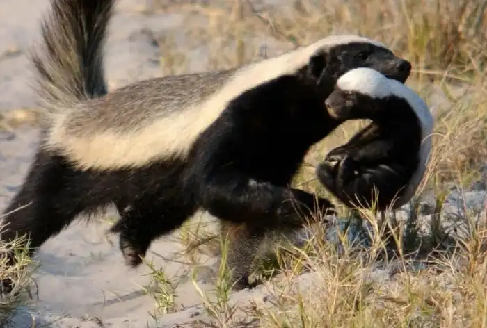 Инстинкт самосохранения подавлен. По степени свирепости медоед не уступает самому крупному представителю куньих — росомахе. У «лысого барсука» как будто напрочь отсутствует инстинкт самосохранения.