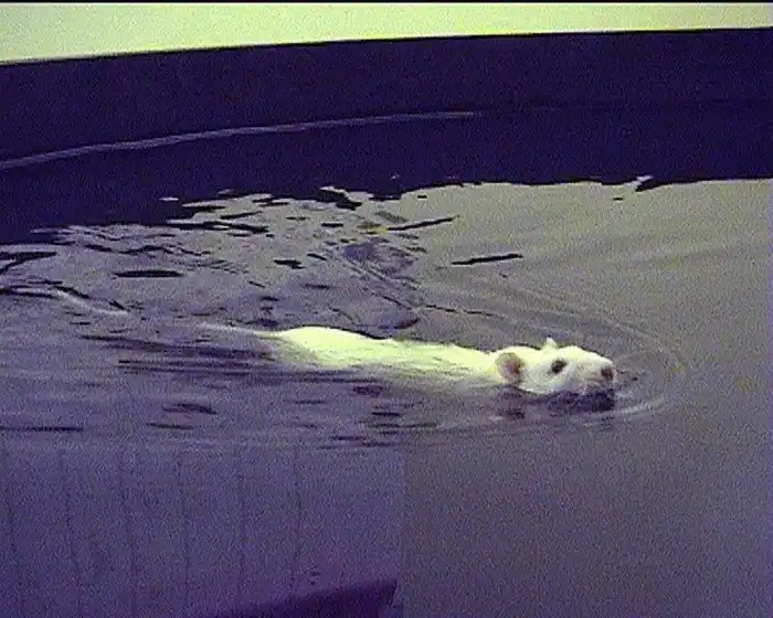 Мышка в водном лабиринте. Где-то под водой есть платформа, на которой можно стоять. Задача мышки — найти её за минимальное время.