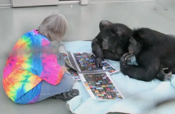 А здесь Канзи и его сестра Панбаниша общаются с исследователем. Панбаниша выучилась нескольким десяткам жестов от своего брата.
