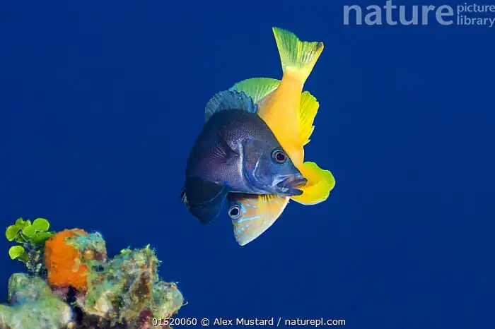 Это рыбы-гамлеты, но обе разных видов. Всего в роде гамлетов насчитывается 17 видов, и, как вы поняли, все они не брезгуют межвидовым скрещиванием.
