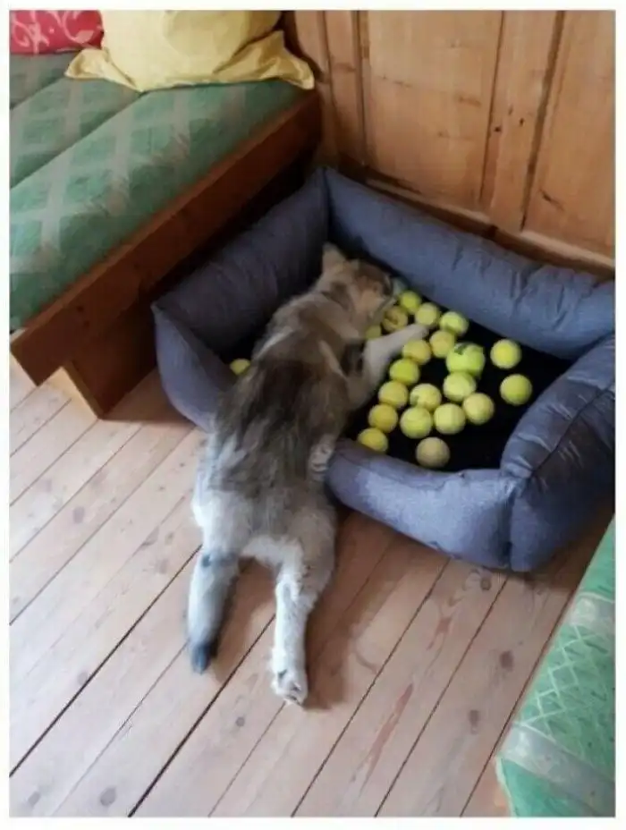 "Наш щенок собрал все мячики и улёгся на них спать"
