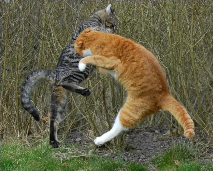 В разгар сражения не стоит пытаться разнять котов голыми руками! Лучше брызнуть на них водой или переключить внимание зверей на резкий шум, например, включить пылесос. Эти меры помогут прекратить потасовку, но чтобы устранить сам конфликт, придется заниматься со специалистом.