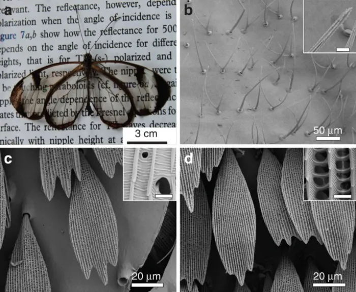 a) Сама бабочка. b) Структура прозрачной части крыла. с) Чешуйки на коричневых областях. d) Чешуйки на белых областях.