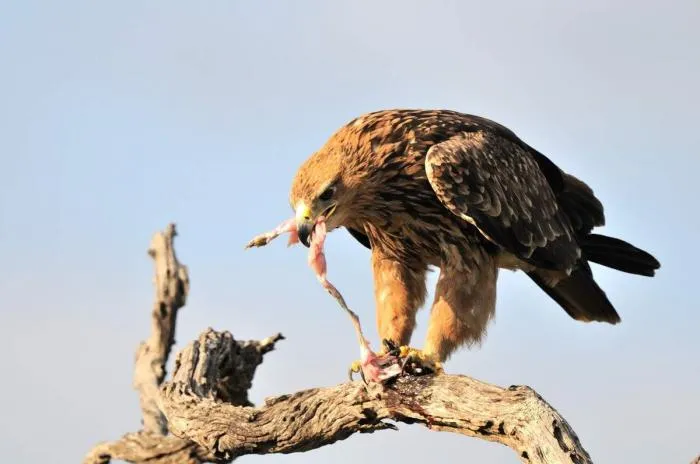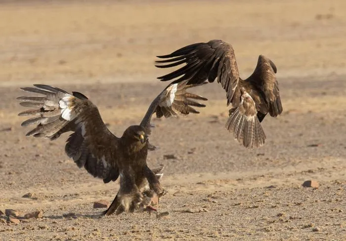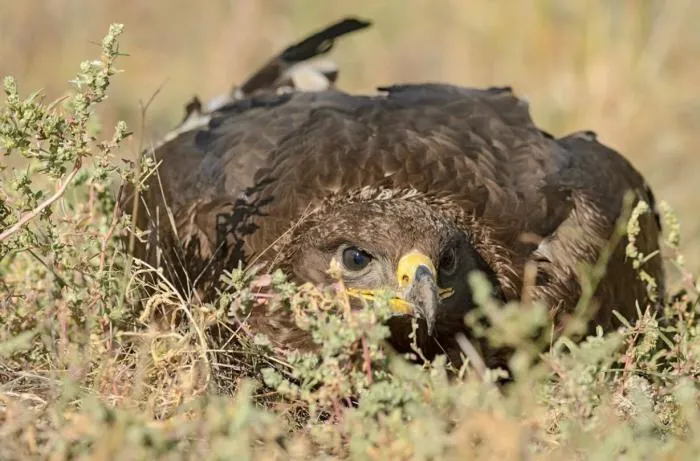 Степные орлы — одни из крупнейших представителей семейства ястребиных. В среднем птички набирают около 3 кило, но самые крупные особи порой весят рекордные 5,5 килограмм. Размах крыльев может быть больше 2,5 метров — внушительная тушка! Добавьте к этому длинные острые когти, зоркие глаза, стальные мускулы, крепкий изогнутый клюв и... ничего не произойдёт! Степной орёл не превратится в мегахищника. Зачем? Им и так неплохо живётся!