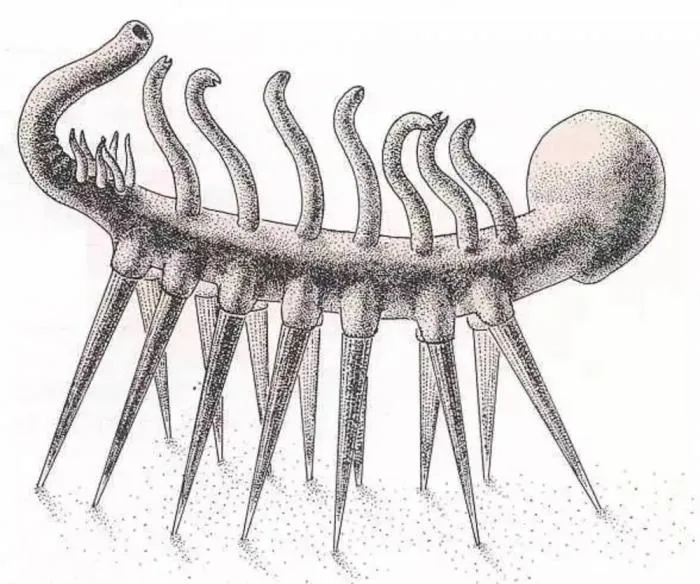 И что же мы в итоге имеем? А имеем мы очень древнего червяка, который обитал почти по всему тогдашнему океану. По дну он перемещался с помощью семи пар когтистых щупалец. А спину защищало такое же количество острых шипов. На «шее» располагались дополнительные длинные тонкие усики. Вероятно, они были покрыты перьевыми структурами для фильтрации органики или поиска пищи на ощупь.