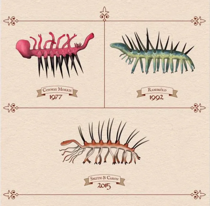 Вернулись к психоделическому червю лишь спустя 14 лет. В 1991 году Ларс Рамскольд и Хоу Сянгуан предложили новый вариант реконструкции. Они буквально перевернули галлюцигению с ног на голову! Точнее, с шипов на тентакли.