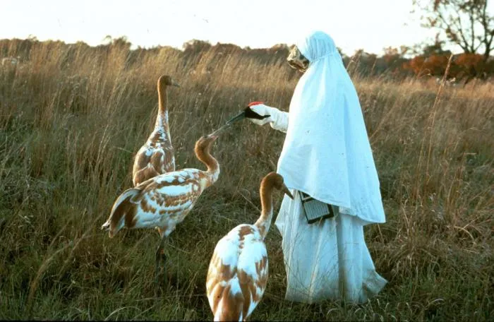 Похоже на секту, но это не секта. Таким образом в заповедниках вскармливают молодых стерхов, чтобы приучить их к правильному стерховому поведению и избежать конфузов с запечатлением, как это произошло с Орешком.