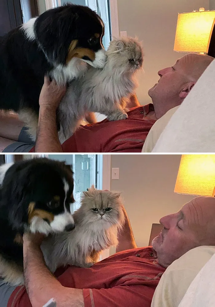 20. "Кошка потребовала почесать животик. Подошла собака, и тоже попросила её погладить"