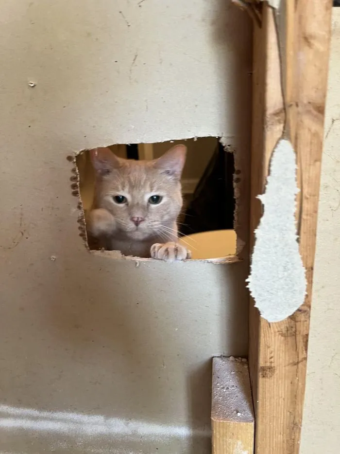3. Ремонтировал ванную комнату, и пришлось вырезать немного гипсокартона. Мой кот весь день наблюдал за мной через эту дыру