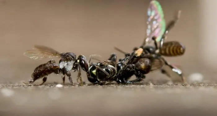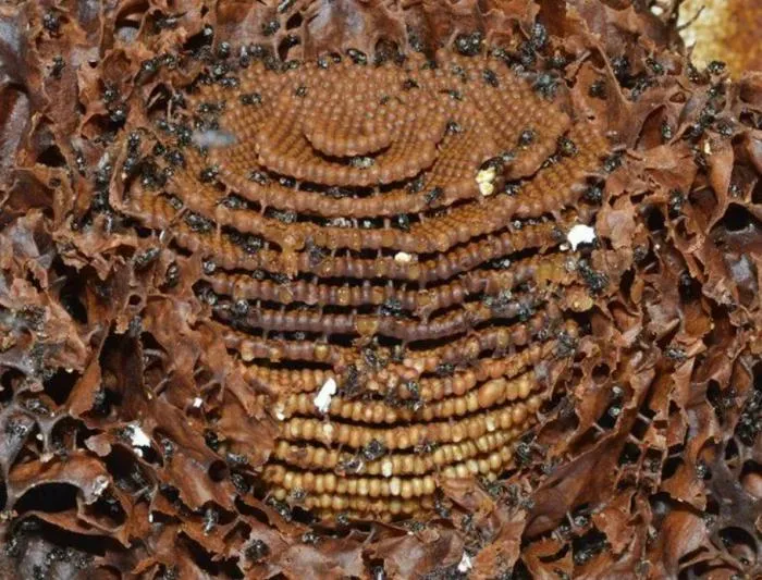 Дело в том, что в гнезде тетрагонулы карбонарии есть лишь один проход. Его пчёлы плотно забивают собственными телами, и для хищника там не остаётся места. Лишь единицы способны прорваться дальше, и это будет смертельной ошибкой. Нарушителя замуруют в стенах улья заживо.