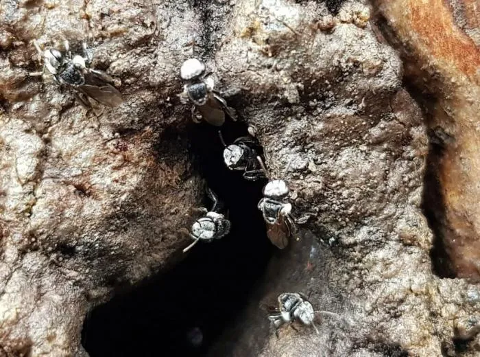 Вход в гнездо тоже с подвохом. Он покрыт ядрёной смесью из смолы и бактерицидного раствора пчелиного производства. Когда фуражиры возвращаются домой, они топают по покрытию и дезинфицируют лапки, что заметно снижает шанс эпидемии или заражения грибками внутри колонии.