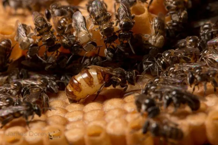 Трудятся австралийские пчёлки круглый год. И размножаются тоже. Чтобы вырастить царицу, нужно и относиться к ней по-особенному. Ячейка, где будет жить будущая принцесса, в два раза больше, чем остальные соты. Появившуюся на свет личинку кормят маточным молочком, которое и превращает её в полноценную самку. В отличие от цариц муравьёв и термитов, молодая пчелиная матка не способна поднять улей с нуля. После знакомства с трутнем она прощается с мамой, забирает часть её подданных и улетает строить новое королевство.