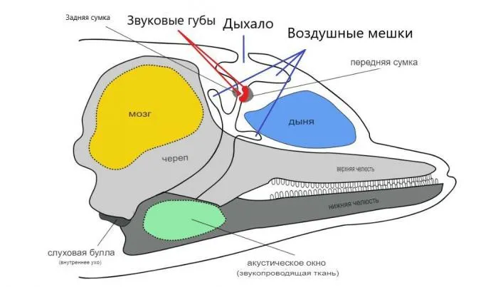 Вокальные губы находятся ровно посередине специальных мешков — пустых камер, в которые можно набрать воздух. Когда кит или дельфин хотят поговорить, они прогоняют воздух из нижнего мешка в верхний. Так воздух проходит через вокальные губы, но при этом не выдыхается через дыхало. Благодаря этому животное не тратит воздух и может говорить, не раскрывая ноздрей!