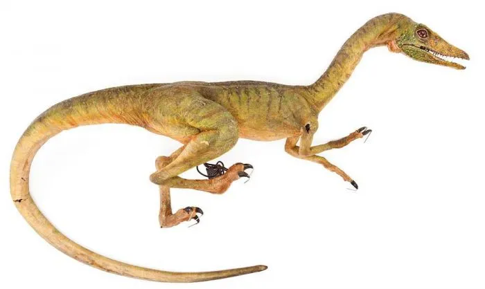 То есть компсогнат стал настоящим королём пустынь, ведь более крупные собратья по дино-цеху там не водились: не подходил им климат и отсутствие пищи в больших объёмах. А этот кроха лупил всё, что попадалось в его изящную вытянутую пастеньку: насекомых, ящериц, даже мелких животных. Длинные конечности позволяли развивать солидную скорость, буквально хватая ошалевшую добычу на лету.