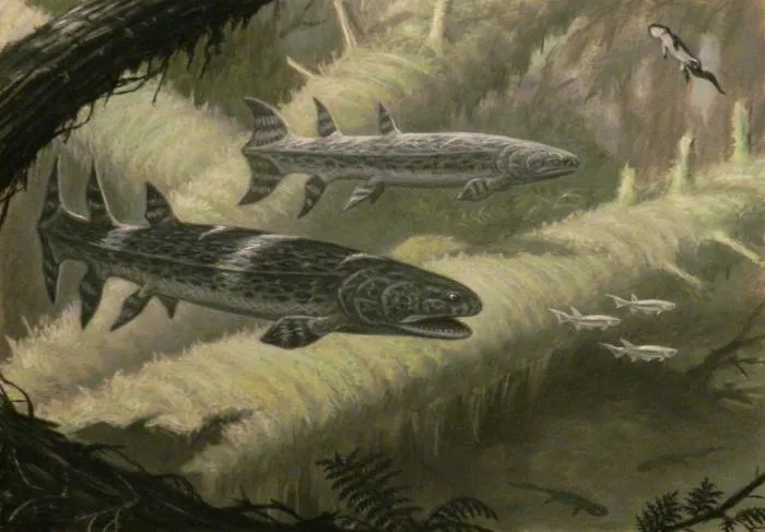 Вот гинерия и глотала всех подряд. Например, пресноводных акул — такие тогда водились. Или земноводных, которые только-только осваивали сушу. Вы же помните про те самые мощные плавники? Расшагивать на них по поверхности с таким весом — миссия невыполнима. Но выскочить на сушу, чтобы сцапать загулявшую амфибию, такие конечности вполне сгодятся.