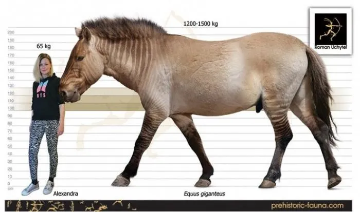 Дело в том, что от гигантской лошади нашли мизерное количество косточек. Все размеры и выводы сделаны на основании всего лишь одного зуба! Зато какого! Он был больше любого другого зуба любой другой лошади вообще. Ну а все остальные умозаключения чисто логические, по аналогии с современными дикими лошадьми. Благо прошло всего-то 12 000 лет.