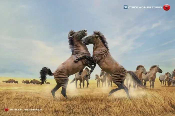 Вообще доисторические лошади почти всегда были небольшими. Некоторые из них и вовсе вырастали не больше лисицы. Но примерно 12 000 лет назад, в конце плейстоцена, на территории Северной Америки появились они — гигантские лошади. Их табуны паслись на огромных равнинах с умеренным климатом. Шкура здесь нужна толстая, а мех — плотный. Примерно такой же вид сейчас имеют лошади Пржевальского. Правда, гигантские лошадки были в 2 раза больше современных диких коняшек!