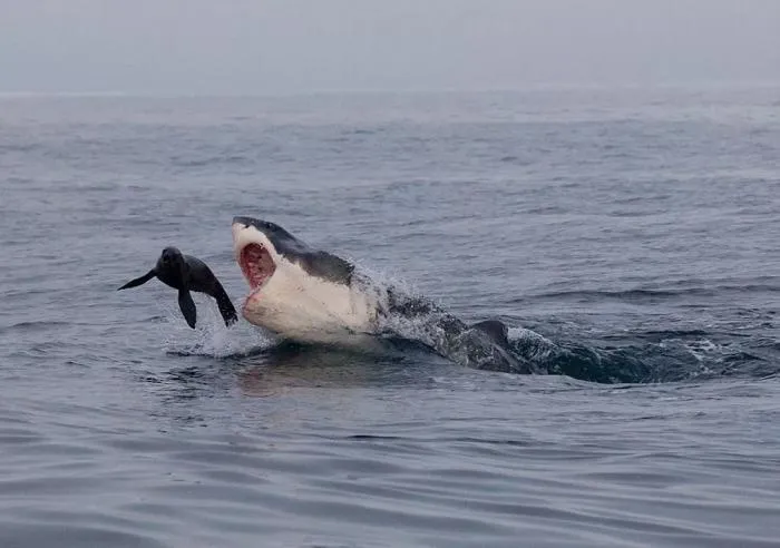 Счастливый тюлень сбежал, увернувшись от страшных зубов в последний момент