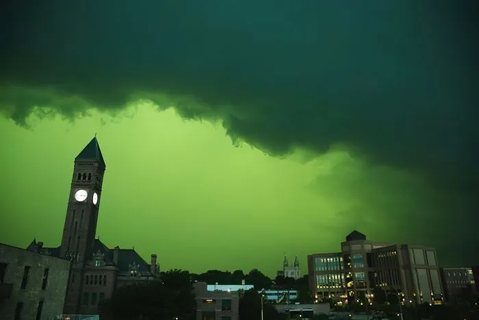 9. Небо над Су-Фолс (Южная Дакота) позеленело во время сильной бури, никаких фильтров