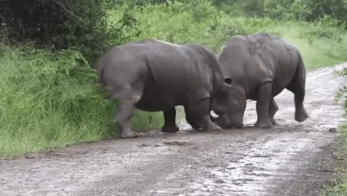 Такой парень отгонит большинство претендентов лишь угрожающим взглядом и громким рыком. Но если тот не отступит, начнётся эпическая схватка. Два двухтонных монстра будут толкаться туловищами и фехтовать на рогах. Задача каждого бойца — нанести удар снизу вверх в относительно мягкое подбрюшье. За счёт силы удара, а также веса рога, самец может пробить кожу противника. И не только её. От трети до половины самцов носорогов погибают в схватках друг с другом из-за травм внутренних органов.