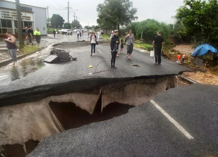 2. Дорога обрушилась во время внезапного наводнения, охватившего город Тувумба в Австралии. 10 января 2001 года