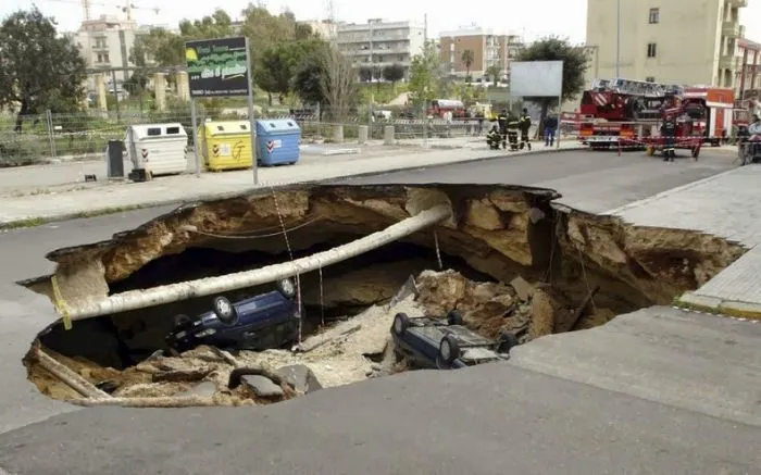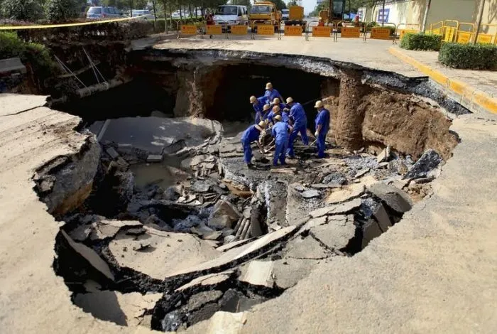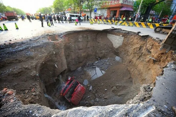5. Воронка рядом с метро в Гуанчжоу, Китай. 28 января 2013 года. Её глубина - 9 метров, а размер - 100-300 квадратных метров
