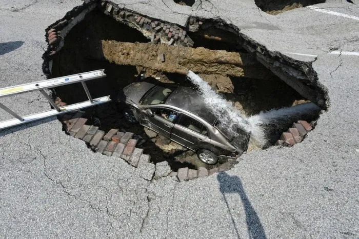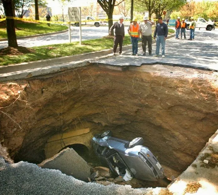 9. Автомобиль с двумя пассажирами упал в карстовую воронку в Балтиморе, США, 28 апреля 2004 года