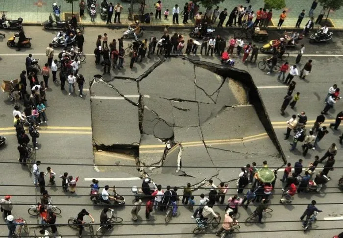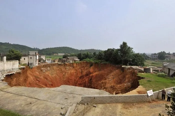 16. Воронка, образовавшаяся возле начальной школы в городе Дачегньцяо, Китай. 15 июня 2010 года