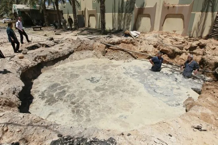 17. Воронка, которая, по словам ливийского правительства, образована в результате авиаударов. Район военных казарм Баб-аль-Азизия, Триполи, Ливия. 12 мая 2011 года
