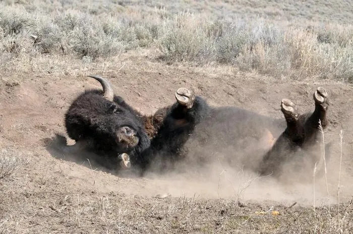 Бизоны обожают валяться. И дело здесь не только в том, что таким образом они чистятся от насекомых. Это стиль социального поведения - так бизоны укрепляют дружбу и отношения друг с другом.