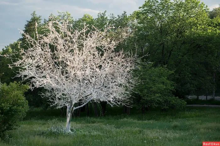Ого, дерево покрыло снегом! Летом! А. Это не снег...