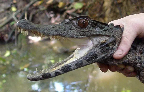 Несмотря на то, что гладколобый кайман Кювье — самый маленький представитель целого отряда, на деле его габариты весьма приличные: средняя длина рептилоида — 1.4 метра, а вес — 5-7 кило. Но биологов заинтересовала не маленькость аллигатора, а строение его головы. Гладколобым вид назвали из-за формы черепа — у каймана полностью отсутствуют надглазничные дуги. Проще говоря, брови. У всех остальных крокодиловых они имеются. Но кайманчик сделал подтяжку лица не ради красоты. Обтекаемая форма помогает ловко передвигаться по бурным рекам с каменистым дном и водопадами.