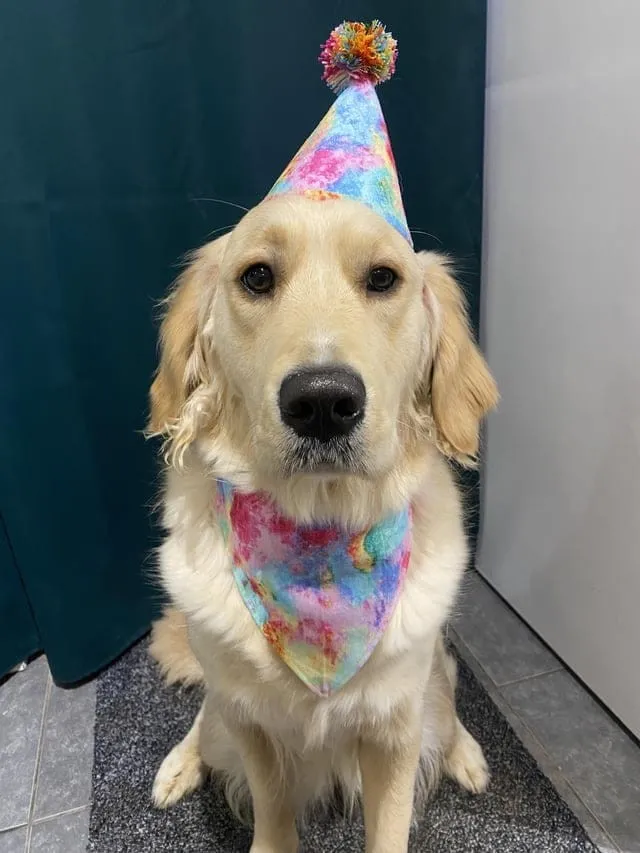 Я сделала своей собаке колпак и бандану на день рождения. Трудно найти забавные аксессуары для больших собак!