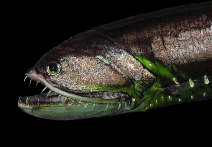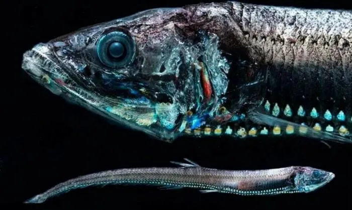 Раз они все похожи друг на друга, как же тогда учёные различают их? Ещё выделяют в разные рода и виды? Во-первых, как мы уже выяснили, разные виды предпочитают жить на разных глубинах. А во-вторых, у жителей сумеречной зоны есть классные штуки — фотофоры. Это специальные органы свечения, располагающиеся на теле. У гоностомовых фотофоры чаще всего расположены на нижней половине тела в один или несколько рядов. И цвета у них могут быть разными — зелёными, синими и красными. По этим светяшкам (или их отсутствию) ученые и определяют принадлежность к виду.