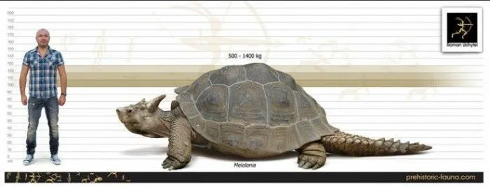 Этот бродяга был скрытошейной черепахой — родственником современных слоновых черепах. Гигантская рептилия бродила по засушливым территориям Австралии и близлежащих островов, лопая зелень. На разных островах жили разные виды — всего их известно 4.