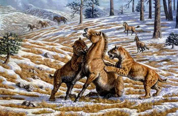 Но и хищники приспосабливались охотиться на быструю и крупную добычу. Короткомордые гиены пахикрокуты нападали на старых и молодых. А саблезубые кошки гомотерии охотились стаями, подолгу преследуя скакунов, отсекая намеченную жертву от основного табуна.