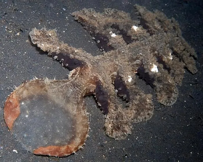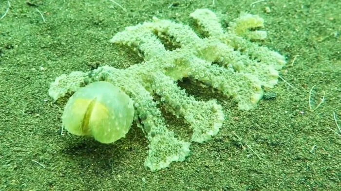 Мелибе — это морской хищный слизняк длиной в 10–14 сантиметров. Слово «слизняк» здесь подходит как нельзя кстати — не представляю, как по-другому описать бесформенную жижу, что растеклась по дну океана. Но такими... особенными мелибе становятся не сразу. В детстве у моллюска даже раковина есть! Но чем старше становится улитка, тем меньше она влезает в узкие рамки своего «домика».